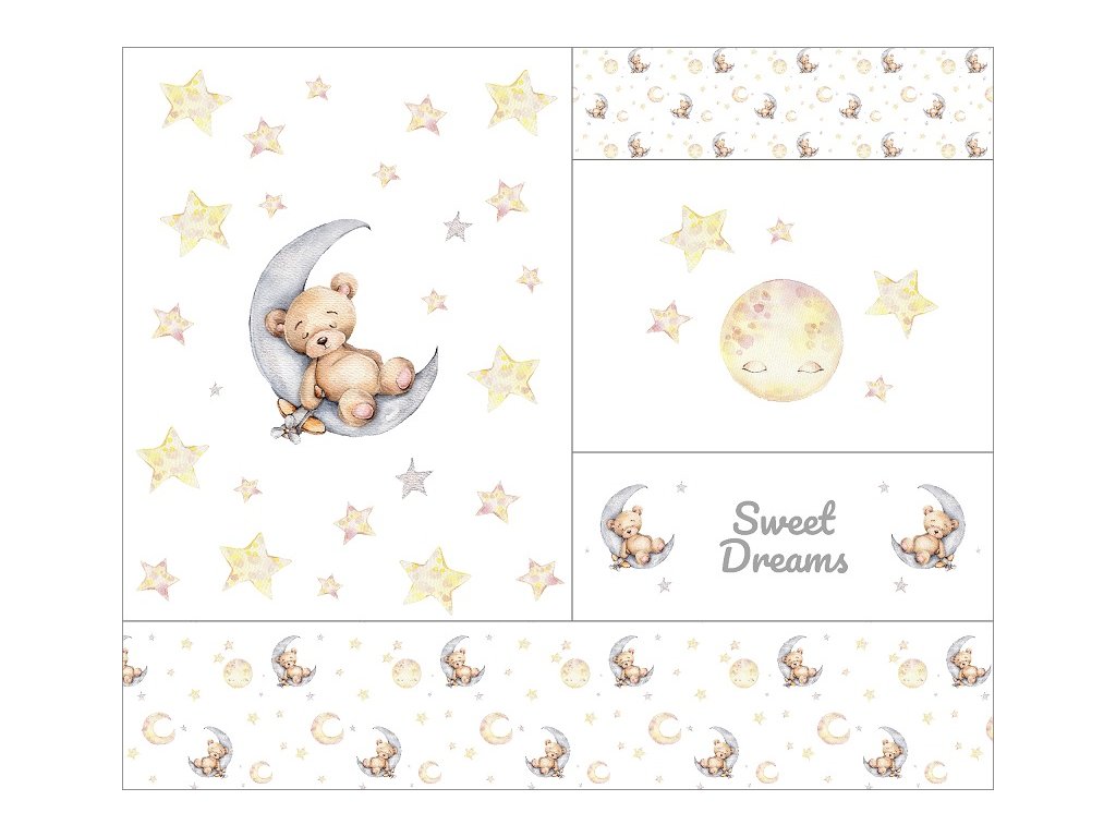 Tento licencovaný tištěný komplet panelů je určen k výrobě dětského setu do postýlky. Jedná se o digitální tisk vysoké kvality na prémiové bavlně. Díky nejmodernějším technologiím pigmentového tisku si i po mnoha praních zachovávají barvy stálost a sytost. Certifikováno pro děti do 3 let. Před šitím nechte vysrážet! Čištění a údržba: praní max na 40° nebělit chemicky nečistitDoplňkové parametry