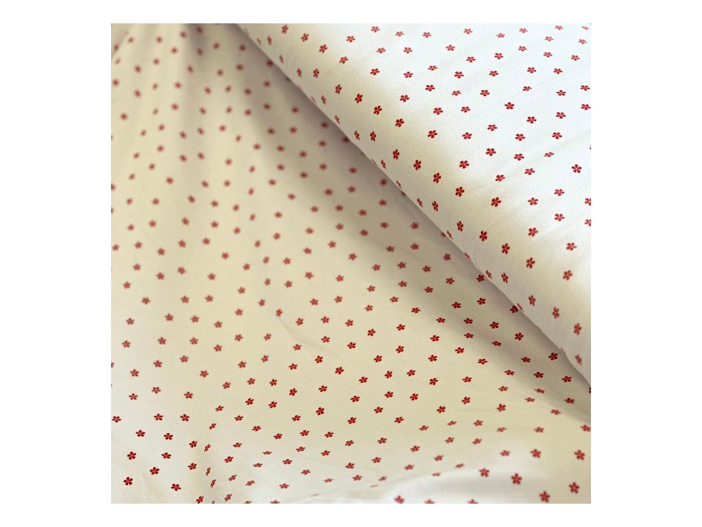 Úplet s jemným a veselým motivem červených minikytiček dodá vašim projektům hravý a svěží vzhled. Perfektně se hodí na dětské oblečení, trička, šaty, mikiny i doplňky. Díky kvalitní bavlněné přízi je látka prodyšná a pohodlná i při celodenním nošení.