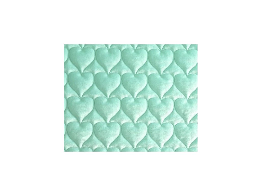 Tato překrásná tkanina, která je prošitá do stylových srdcí má širokou škálu využití nejen pro děti. Mohou se z ní šít hnízdečka, mantinely do postýlky, deky aj. Díky svému krásnému zbarvení a jemnému lesku na světle působí velmi luxusně. Dá se krásně kombinovat s hladkým sametem se stejnou strukturou, ale i s tištěnou bavlnou. Jedná se o velmi kvalitní materiál vhodný samozřejmě pro děti. Nezávadnost textilie výrobce garantuje certifikátem Öko-Tex Standard100. Čištění a údržba: praní na 30° nesušit v sušičce nežehlit