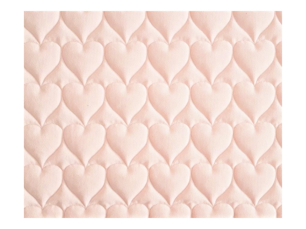 Tato překrásná tkanina, která je prošitá do stylových srdcí má širokou škálu využití nejen pro děti. Mohou se z ní šít hnízdečka, mantinely do postýlky, deky aj. Díky svému krásnému zbarvení a jemnému lesku na světle působí velmi luxusně. Dá se krásně kombinovat s hladkým sametem se stejnou strukturou, ale i s tištěnou bavlnou. Jedná se o velmi kvalitní materiál vhodný samozřejmě pro děti. Nezávadnost textilie výrobce garantuje certifikátem Öko-Tex Standard100. Čištění a údržba: praní na 30° nesušit v sušičce nežehlit